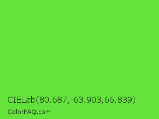 CIELab 80.687,-63.903,66.839 Color is a normal green color and the nearest color is Kiwi #8ee53f. Hex code #63e33b and RGB value is rgb(99,227,59). In RGB color space, this color is composed of 39% red, 89% green, 23% blue, In CMYK color space, this color is composed of 56% cyan, 0% magenta, 74% yellow , 11% black , In HSL color space, this color has a hue angle of 106° , 75% saturation and 56% lightness.