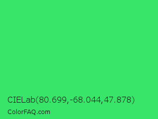 CIELab 80.699,-68.044,47.878 Color is a normal green color and the nearest color is UFO Green #3cd070. Hex code #39e569 and RGB value is rgb(57,229,105). In RGB color space, this color is composed of 22% red, 90% green, 41% blue, In CMYK color space, this color is composed of 75% cyan, 0% magenta, 54% yellow , 10% black , In HSL color space, this color has a hue angle of 137° , 77% saturation and 56% lightness.