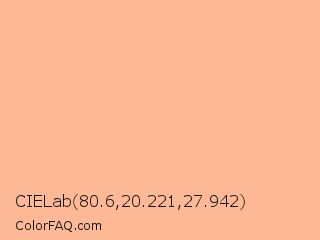 CIELab 80.6,20.221,27.942 Color is a light orange color and the nearest color is Macaroni And Cheese #ffbd88. Hex code #fdb995 and RGB value is rgb(253,185,149). In RGB color space, this color is composed of 99% red, 73% green, 58% blue, In CMYK color space, this color is composed of 0% cyan, 27% magenta, 41% yellow , 1% black , In HSL color space, this color has a hue angle of 21° , 96% saturation and 79% lightness.