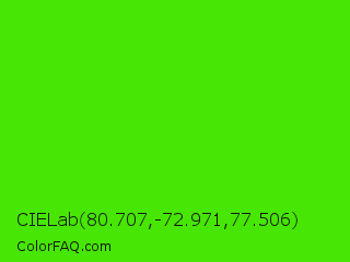 CIELab 80.707,-72.971,77.506 Color is a normal green color and the nearest color is Chlorophyll Green #4aff00. Hex code #47e604 and RGB value is rgb(71,230,4). In RGB color space, this color is composed of 28% red, 90% green, 2% blue, In CMYK color space, this color is composed of 69% cyan, 0% magenta, 98% yellow , 10% black , In HSL color space, this color has a hue angle of 102° , 97% saturation and 46% lightness.
