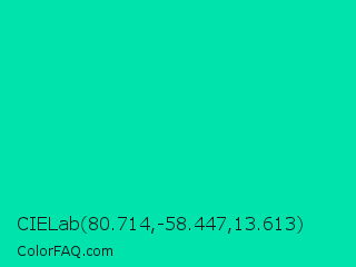 CIELab 80.714,-58.447,13.613 Color is a normal cyan color and the nearest color is Medium Spring Green #00fa9a. Hex code #00e3ad and RGB value is rgb(0,227,173). In RGB color space, this color is composed of 0% red, 89% green, 68% blue, In CMYK color space, this color is composed of 100% cyan, 0% magenta, 24% yellow , 11% black , In HSL color space, this color has a hue angle of 166° , 100% saturation and 45% lightness.