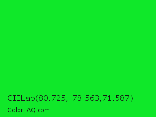 CIELab 80.725,-78.563,71.587 Color is a normal green color and the nearest color is Vivid Malachite #00cc33. Hex code #0fe829 and RGB value is rgb(15,232,41). In RGB color space, this color is composed of 6% red, 91% green, 16% blue, In CMYK color space, this color is composed of 94% cyan, 0% magenta, 82% yellow , 9% black , In HSL color space, this color has a hue angle of 127° , 88% saturation and 48% lightness.