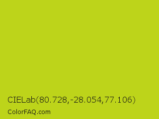 CIELab 80.728,-28.054,77.106 Color is a normal yellow color and the nearest color is Key Lime Pie #bfc921. Hex code #bdd41a and RGB value is rgb(189,212,26). In RGB color space, this color is composed of 74% red, 83% green, 10% blue, In CMYK color space, this color is composed of 11% cyan, 0% magenta, 88% yellow , 17% black , In HSL color space, this color has a hue angle of 67° , 78% saturation and 47% lightness.
