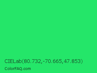 CIELab 80.732,-70.665,47.853 Color is a normal green color and the nearest color is UFO Green #3cd070. Hex code #24e669 and RGB value is rgb(36,230,105). In RGB color space, this color is composed of 14% red, 90% green, 41% blue, In CMYK color space, this color is composed of 84% cyan, 0% magenta, 54% yellow , 10% black , In HSL color space, this color has a hue angle of 141° , 80% saturation and 52% lightness.