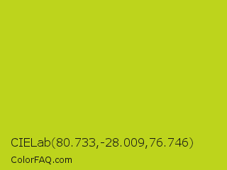 CIELab 80.733,-28.009,76.746 Color is a normal yellow color and the nearest color is Key Lime Pie #bfc921. Hex code #bdd41c and RGB value is rgb(189,212,28). In RGB color space, this color is composed of 74% red, 83% green, 11% blue, In CMYK color space, this color is composed of 11% cyan, 0% magenta, 87% yellow , 17% black , In HSL color space, this color has a hue angle of 68° , 77% saturation and 47% lightness.