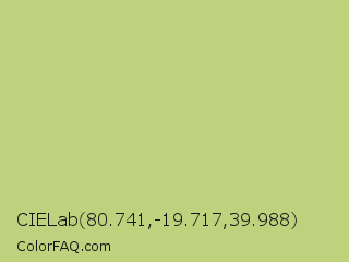 CIELab 80.741,-19.717,39.988 Color is a light lime color and the nearest color is Yellow Green #c5e17a. Hex code #bed17c and RGB value is rgb(190,209,124). In RGB color space, this color is composed of 75% red, 82% green, 49% blue, In CMYK color space, this color is composed of 9% cyan, 0% magenta, 41% yellow , 18% black , In HSL color space, this color has a hue angle of 73° , 48% saturation and 65% lightness.