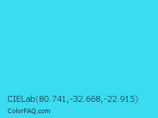 CIELab 80.741,-32.668,-22.915 Color is a normal cyan color and the nearest color is Turquoise #40e0d0. Hex code #3bdbf2 and RGB value is rgb(59,219,242). In RGB color space, this color is composed of 23% red, 86% green, 95% blue, In CMYK color space, this color is composed of 76% cyan, 10% magenta, 0% yellow , 5% black , In HSL color space, this color has a hue angle of 188° , 88% saturation and 59% lightness.