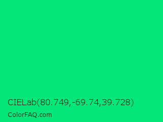 CIELab 80.749,-69.74,39.728 Color is a normal green color and the nearest color is Spring Green #00ff7f. Hex code #03e67a and RGB value is rgb(3,230,122). In RGB color space, this color is composed of 1% red, 90% green, 48% blue, In CMYK color space, this color is composed of 99% cyan, 0% magenta, 47% yellow , 10% black , In HSL color space, this color has a hue angle of 151° , 97% saturation and 46% lightness.