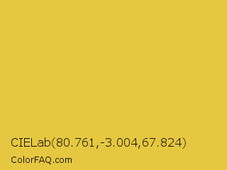 CIELab 80.761,-3.004,67.824 Color is a normal yellow color and the nearest color is Sandstorm #ecd540. Hex code #e6c740 and RGB value is rgb(230,199,64). In RGB color space, this color is composed of 90% red, 78% green, 25% blue, In CMYK color space, this color is composed of 0% cyan, 13% magenta, 72% yellow , 10% black , In HSL color space, this color has a hue angle of 49° , 77% saturation and 58% lightness.