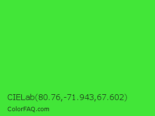 CIELab 80.76,-71.943,67.602 Color is a normal green color and the nearest color is Lime Green #32cd32. Hex code #42e638 and RGB value is rgb(66,230,56). In RGB color space, this color is composed of 26% red, 90% green, 22% blue, In CMYK color space, this color is composed of 71% cyan, 0% magenta, 76% yellow , 10% black , In HSL color space, this color has a hue angle of 117° , 78% saturation and 56% lightness.