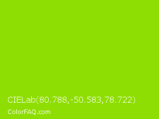 CIELab 80.788,-50.583,78.722 Color is a normal green color and the nearest color is Sheen Green #8fd400. Hex code #8fde03 and RGB value is rgb(143,222,3). In RGB color space, this color is composed of 56% red, 87% green, 1% blue, In CMYK color space, this color is composed of 36% cyan, 0% magenta, 99% yellow , 13% black , In HSL color space, this color has a hue angle of 82° , 97% saturation and 44% lightness.