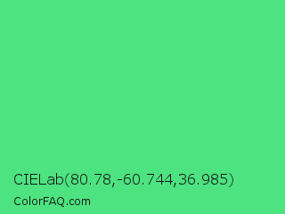 CIELab 80.78,-60.744,36.985 Color is a normal green color and the nearest color is Very Light Malachite Green #64e986. Hex code #4de380 and RGB value is rgb(77,227,128). In RGB color space, this color is composed of 30% red, 89% green, 50% blue, In CMYK color space, this color is composed of 66% cyan, 0% magenta, 44% yellow , 11% black , In HSL color space, this color has a hue angle of 140° , 73% saturation and 60% lightness.