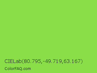 CIELab 80.795,-49.719,63.167 Color is a normal green color and the nearest color is Kiwi #8ee53f. Hex code #8ade47 and RGB value is rgb(138,222,71). In RGB color space, this color is composed of 54% red, 87% green, 28% blue, In CMYK color space, this color is composed of 38% cyan, 0% magenta, 68% yellow , 13% black , In HSL color space, this color has a hue angle of 93° , 70% saturation and 57% lightness.