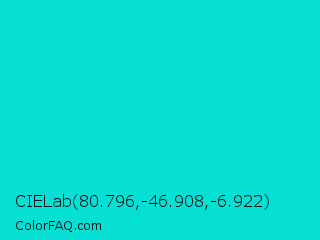 CIELab 80.796,-46.908,-6.922 Color is a normal cyan color and the nearest color is Bright Turquoise #08e8de. Hex code #06e0d4 and RGB value is rgb(6,224,212). In RGB color space, this color is composed of 2% red, 88% green, 83% blue, In CMYK color space, this color is composed of 97% cyan, 0% magenta, 5% yellow , 12% black , In HSL color space, this color has a hue angle of 177° , 95% saturation and 45% lightness.