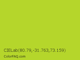 CIELab 80.79,-31.763,73.159 Color is a normal lime color and the nearest color is Key Lime Pie #bfc921. Hex code #b5d62b and RGB value is rgb(181,214,43). In RGB color space, this color is composed of 71% red, 84% green, 17% blue, In CMYK color space, this color is composed of 15% cyan, 0% magenta, 80% yellow , 16% black , In HSL color space, this color has a hue angle of 72° , 68% saturation and 50% lightness.