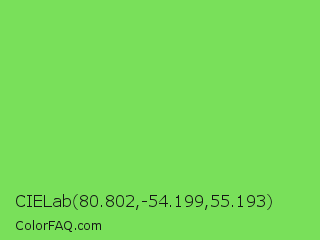 CIELab 80.802,-54.199,55.193 Color is a light green color and the nearest color is Pastel Green #77dd77. Hex code #79e05a and RGB value is rgb(121,224,90). In RGB color space, this color is composed of 47% red, 88% green, 35% blue, In CMYK color space, this color is composed of 46% cyan, 0% magenta, 60% yellow , 12% black , In HSL color space, this color has a hue angle of 106° , 68% saturation and 62% lightness.