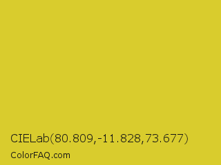 CIELab 80.809,-11.828,73.677 Color is a normal yellow color and the nearest color is Sunflower #e4d422. Hex code #d9cc2d and RGB value is rgb(217,204,45). In RGB color space, this color is composed of 85% red, 80% green, 18% blue, In CMYK color space, this color is composed of 0% cyan, 6% magenta, 79% yellow , 15% black , In HSL color space, this color has a hue angle of 55° , 69% saturation and 51% lightness.