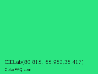CIELab 80.815,-65.962,36.417 Color is a normal green color and the nearest color is UFO Green #3cd070. Hex code #2be581 and RGB value is rgb(43,229,129). In RGB color space, this color is composed of 17% red, 90% green, 51% blue, In CMYK color space, this color is composed of 81% cyan, 0% magenta, 44% yellow , 10% black , In HSL color space, this color has a hue angle of 148° , 78% saturation and 53% lightness.