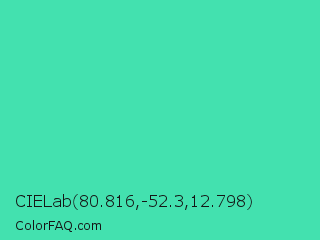 CIELab 80.816,-52.3,12.798 Color is a normal green color and the nearest color is Eucalyptus #44d7a8. Hex code #43e1af and RGB value is rgb(67,225,175). In RGB color space, this color is composed of 26% red, 88% green, 69% blue, In CMYK color space, this color is composed of 70% cyan, 0% magenta, 22% yellow , 12% black , In HSL color space, this color has a hue angle of 161° , 72% saturation and 57% lightness.