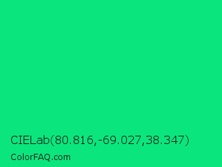 CIELab 80.816,-69.027,38.347 Color is a normal green color and the nearest color is Spring Green #00ff7f. Hex code #0ae67d and RGB value is rgb(10,230,125). In RGB color space, this color is composed of 4% red, 90% green, 49% blue, In CMYK color space, this color is composed of 96% cyan, 0% magenta, 46% yellow , 10% black , In HSL color space, this color has a hue angle of 151° , 92% saturation and 47% lightness.