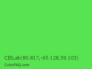 CIELab 80.817,-65.128,59.103 Color is a normal green color and the nearest color is Screamin Green #66ff66. Hex code #58e450 and RGB value is rgb(88,228,80). In RGB color space, this color is composed of 35% red, 89% green, 31% blue, In CMYK color space, this color is composed of 61% cyan, 0% magenta, 65% yellow , 11% black , In HSL color space, this color has a hue angle of 117° , 73% saturation and 60% lightness.