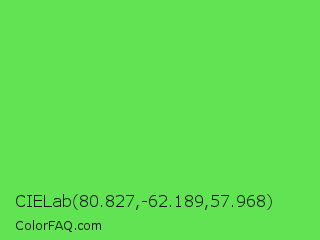 CIELab 80.827,-62.189,57.968 Color is a light green color and the nearest color is Screamin Green #66ff66. Hex code #62e353 and RGB value is rgb(98,227,83). In RGB color space, this color is composed of 38% red, 89% green, 33% blue, In CMYK color space, this color is composed of 57% cyan, 0% magenta, 63% yellow , 11% black , In HSL color space, this color has a hue angle of 114° , 72% saturation and 61% lightness.