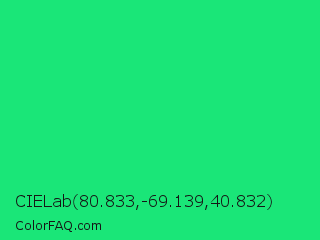 CIELab 80.833,-69.139,40.832 Color is a normal green color and the nearest color is Spring Green #00ff7f. Hex code #1ae678 and RGB value is rgb(26,230,120). In RGB color space, this color is composed of 10% red, 90% green, 47% blue, In CMYK color space, this color is composed of 89% cyan, 0% magenta, 48% yellow , 10% black , In HSL color space, this color has a hue angle of 148° , 80% saturation and 50% lightness.