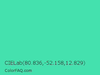 CIELab 80.836,-52.158,12.829 Color is a normal green color and the nearest color is Eucalyptus #44d7a8. Hex code #44e1af and RGB value is rgb(68,225,175). In RGB color space, this color is composed of 27% red, 88% green, 69% blue, In CMYK color space, this color is composed of 70% cyan, 0% magenta, 22% yellow , 12% black , In HSL color space, this color has a hue angle of 161° , 72% saturation and 57% lightness.