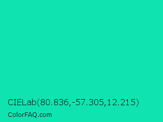 CIELab 80.836,-57.305,12.215 Color is a normal cyan color and the nearest color is Amazonite #00c4b0. Hex code #0fe3b0 and RGB value is rgb(15,227,176). In RGB color space, this color is composed of 6% red, 89% green, 69% blue, In CMYK color space, this color is composed of 93% cyan, 0% magenta, 22% yellow , 11% black , In HSL color space, this color has a hue angle of 166° , 88% saturation and 47% lightness.