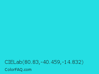 CIELab 80.83,-40.459,-14.832 Color is a normal cyan color and the nearest color is Bright Turquoise #08e8de. Hex code #24dee3 and RGB value is rgb(36,222,227). In RGB color space, this color is composed of 14% red, 87% green, 89% blue, In CMYK color space, this color is composed of 84% cyan, 2% magenta, 0% yellow , 11% black , In HSL color space, this color has a hue angle of 182° , 77% saturation and 52% lightness.