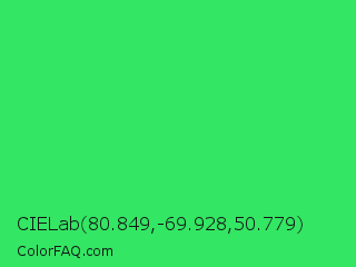 CIELab 80.849,-69.928,50.779 Color is a normal green color and the nearest color is UFO Green #3cd070. Hex code #33e663 and RGB value is rgb(51,230,99). In RGB color space, this color is composed of 20% red, 90% green, 39% blue, In CMYK color space, this color is composed of 78% cyan, 0% magenta, 57% yellow , 10% black , In HSL color space, this color has a hue angle of 136° , 78% saturation and 55% lightness.