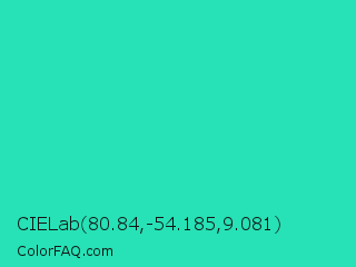 CIELab 80.84,-54.185,9.081 Color is a normal cyan color and the nearest color is Turquoise PWG #30d5c8. Hex code #26e2b6 and RGB value is rgb(38,226,182). In RGB color space, this color is composed of 15% red, 89% green, 71% blue, In CMYK color space, this color is composed of 83% cyan, 0% magenta, 19% yellow , 11% black , In HSL color space, this color has a hue angle of 166° , 76% saturation and 52% lightness.