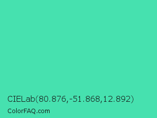 CIELab 80.876,-51.868,12.892 Color is a normal green color and the nearest color is Eucalyptus #44d7a8. Hex code #46e1af and RGB value is rgb(70,225,175). In RGB color space, this color is composed of 27% red, 88% green, 69% blue, In CMYK color space, this color is composed of 69% cyan, 0% magenta, 22% yellow , 12% black , In HSL color space, this color has a hue angle of 161° , 72% saturation and 58% lightness.