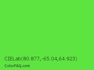 CIELab 80.877,-65.04,64.923 Color is a normal green color and the nearest color is Screamin Green #66ff66. Hex code #5ee441 and RGB value is rgb(94,228,65). In RGB color space, this color is composed of 37% red, 89% green, 25% blue, In CMYK color space, this color is composed of 59% cyan, 0% magenta, 71% yellow , 11% black , In HSL color space, this color has a hue angle of 109° , 75% saturation and 57% lightness.