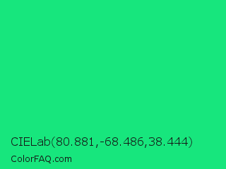 CIELab 80.881,-68.486,38.444 Color is a normal green color and the nearest color is Spring Green #00ff7f. Hex code #17e67d and RGB value is rgb(23,230,125). In RGB color space, this color is composed of 9% red, 90% green, 49% blue, In CMYK color space, this color is composed of 90% cyan, 0% magenta, 46% yellow , 10% black , In HSL color space, this color has a hue angle of 150° , 82% saturation and 50% lightness.