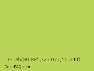 CIELab 80.885,-26.077,56.244 Color is a normal lime color and the nearest color is June Bud #bdda57. Hex code #bad45a and RGB value is rgb(186,212,90). In RGB color space, this color is composed of 73% red, 83% green, 35% blue, In CMYK color space, this color is composed of 12% cyan, 0% magenta, 58% yellow , 17% black , In HSL color space, this color has a hue angle of 73° , 59% saturation and 59% lightness.