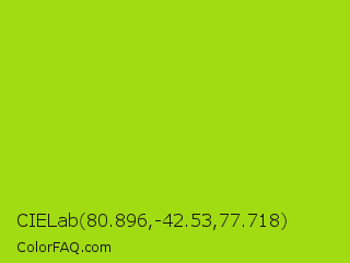 CIELab 80.896,-42.53,77.718 Color is a normal lime color and the nearest color is Vivid Lime Green #a6d608. Hex code #a1db12 and RGB value is rgb(161,219,18). In RGB color space, this color is composed of 63% red, 86% green, 7% blue, In CMYK color space, this color is composed of 26% cyan, 0% magenta, 92% yellow , 14% black , In HSL color space, this color has a hue angle of 77° , 85% saturation and 46% lightness.