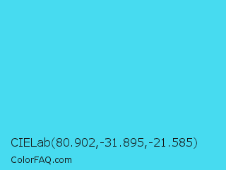 CIELab 80.902,-31.895,-21.585 Color is a light cyan color and the nearest color is Turquoise #40e0d0. Hex code #47dbf0 and RGB value is rgb(71,219,240). In RGB color space, this color is composed of 28% red, 86% green, 94% blue, In CMYK color space, this color is composed of 70% cyan, 9% magenta, 0% yellow , 6% black , In HSL color space, this color has a hue angle of 187° , 85% saturation and 61% lightness.