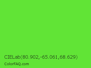 CIELab 80.902,-65.061,68.629 Color is a normal green color and the nearest color is Kiwi #8ee53f. Hex code #61e436 and RGB value is rgb(97,228,54). In RGB color space, this color is composed of 38% red, 89% green, 21% blue, In CMYK color space, this color is composed of 57% cyan, 0% magenta, 76% yellow , 11% black , In HSL color space, this color has a hue angle of 105° , 76% saturation and 55% lightness.