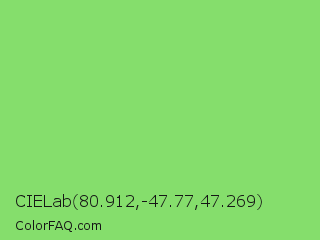 CIELab 80.912,-47.77,47.269 Color is a light green color and the nearest color is Pastel Green #77dd77. Hex code #85de6c and RGB value is rgb(133,222,108). In RGB color space, this color is composed of 52% red, 87% green, 42% blue, In CMYK color space, this color is composed of 40% cyan, 0% magenta, 51% yellow , 13% black , In HSL color space, this color has a hue angle of 107° , 63% saturation and 65% lightness.