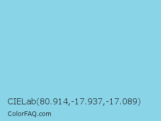 CIELab 80.914,-17.937,-17.089 Color is a light cyan color and the nearest color is Sky Blue #87ceeb. Hex code #8ad4e8 and RGB value is rgb(138,212,232). In RGB color space, this color is composed of 54% red, 83% green, 91% blue, In CMYK color space, this color is composed of 41% cyan, 9% magenta, 0% yellow , 9% black , In HSL color space, this color has a hue angle of 193° , 67% saturation and 73% lightness.