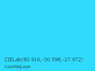 CIELab 80.916,-30.598,-27.972 Color is a normal cyan color and the nearest color is Loeen #15f2fd. Hex code #30dbfc and RGB value is rgb(48,219,252). In RGB color space, this color is composed of 19% red, 86% green, 99% blue, In CMYK color space, this color is composed of 81% cyan, 13% magenta, 0% yellow , 1% black , In HSL color space, this color has a hue angle of 190° , 97% saturation and 59% lightness.