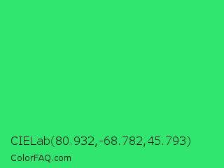 CIELab 80.932,-68.782,45.793 Color is a normal green color and the nearest color is UFO Green #3cd070. Hex code #30e66e and RGB value is rgb(48,230,110). In RGB color space, this color is composed of 19% red, 90% green, 43% blue, In CMYK color space, this color is composed of 79% cyan, 0% magenta, 52% yellow , 10% black , In HSL color space, this color has a hue angle of 140° , 78% saturation and 55% lightness.