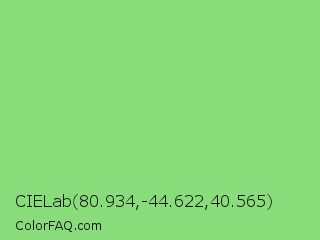 CIELab 80.934,-44.622,40.565 Color is a light green color and the nearest color is Pastel Green #77dd77. Hex code #88dd7a and RGB value is rgb(136,221,122). In RGB color space, this color is composed of 53% red, 87% green, 48% blue, In CMYK color space, this color is composed of 38% cyan, 0% magenta, 45% yellow , 13% black , In HSL color space, this color has a hue angle of 112° , 59% saturation and 67% lightness.