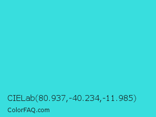 CIELab 80.937,-40.234,-11.985 Color is a normal cyan color and the nearest color is Turquoise #40e0d0. Hex code #38dede and RGB value is rgb(56,222,222). In RGB color space, this color is composed of 22% red, 87% green, 87% blue, In CMYK color space, this color is composed of 75% cyan, 0% magenta, 0% yellow , 13% black , In HSL color space, this color has a hue angle of 180° , 72% saturation and 55% lightness.