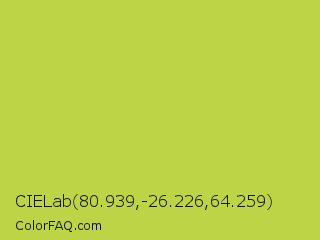 CIELab 80.939,-26.226,64.259 Color is a normal yellow color and the nearest color is June Bud #bdda57. Hex code #bdd447 and RGB value is rgb(189,212,71). In RGB color space, this color is composed of 74% red, 83% green, 28% blue, In CMYK color space, this color is composed of 11% cyan, 0% magenta, 67% yellow , 17% black , In HSL color space, this color has a hue angle of 70° , 62% saturation and 55% lightness.