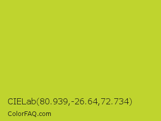 CIELab 80.939,-26.64,72.734 Color is a normal yellow color and the nearest color is Key Lime Pie #bfc921. Hex code #bfd42e and RGB value is rgb(191,212,46). In RGB color space, this color is composed of 75% red, 83% green, 18% blue, In CMYK color space, this color is composed of 10% cyan, 0% magenta, 78% yellow , 17% black , In HSL color space, this color has a hue angle of 68° , 66% saturation and 51% lightness.