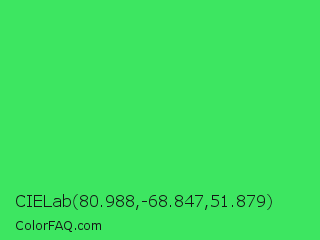 CIELab 80.988,-68.847,51.879 Color is a normal green color and the nearest color is UFO Green #3cd070. Hex code #3de661 and RGB value is rgb(61,230,97). In RGB color space, this color is composed of 24% red, 90% green, 38% blue, In CMYK color space, this color is composed of 73% cyan, 0% magenta, 58% yellow , 10% black , In HSL color space, this color has a hue angle of 133° , 77% saturation and 57% lightness.
