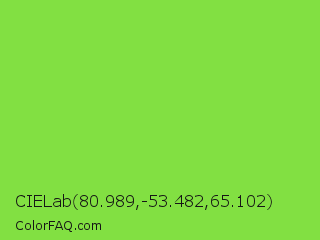 CIELab 80.989,-53.482,65.102 Color is a normal green color and the nearest color is Kiwi #8ee53f. Hex code #82e042 and RGB value is rgb(130,224,66). In RGB color space, this color is composed of 51% red, 88% green, 26% blue, In CMYK color space, this color is composed of 42% cyan, 0% magenta, 71% yellow , 12% black , In HSL color space, this color has a hue angle of 96° , 72% saturation and 57% lightness.