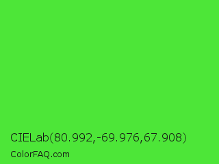 CIELab 80.992,-69.976,67.908 Color is a normal green color and the nearest color is Lime Green #32cd32. Hex code #4de638 and RGB value is rgb(77,230,56). In RGB color space, this color is composed of 30% red, 90% green, 22% blue, In CMYK color space, this color is composed of 67% cyan, 0% magenta, 76% yellow , 10% black , In HSL color space, this color has a hue angle of 113° , 78% saturation and 56% lightness.